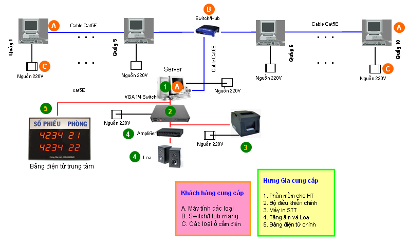 Trong mô hình dưới đây, chúng tôi sẽ cung cấp máy in STT, phần mềm, loa và một bảng điện tử chung (tuỳ chọn), phía khách hàng có sẵn các máy tính nối mạng LAN.